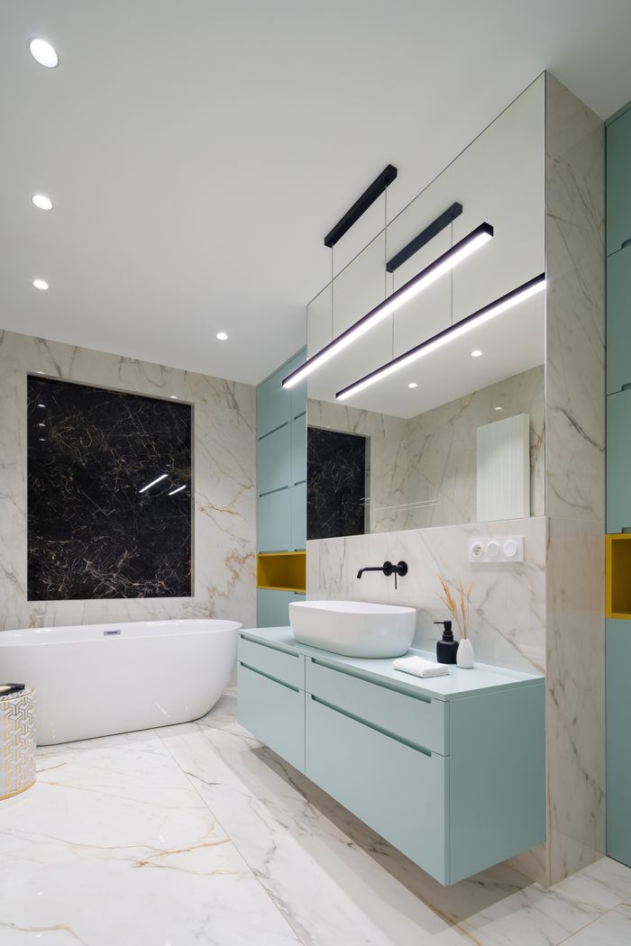 Вне зависимости от площади необходимо общее освещение и рабочее у зоны зеркала (удобнее всего парные светильники по бокам). Декоративная подсветка уместна, например, по плинтусу или из-под навесных предметов мебели.