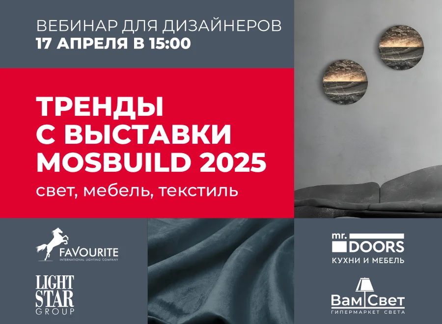 4 спикера от брендов Mr.Doors, Favourite и Lightstar в прямом эфире расскажут, какой свет, мебель, шторы и текстиль сейчас считаются самыми топовыми и актуальными.