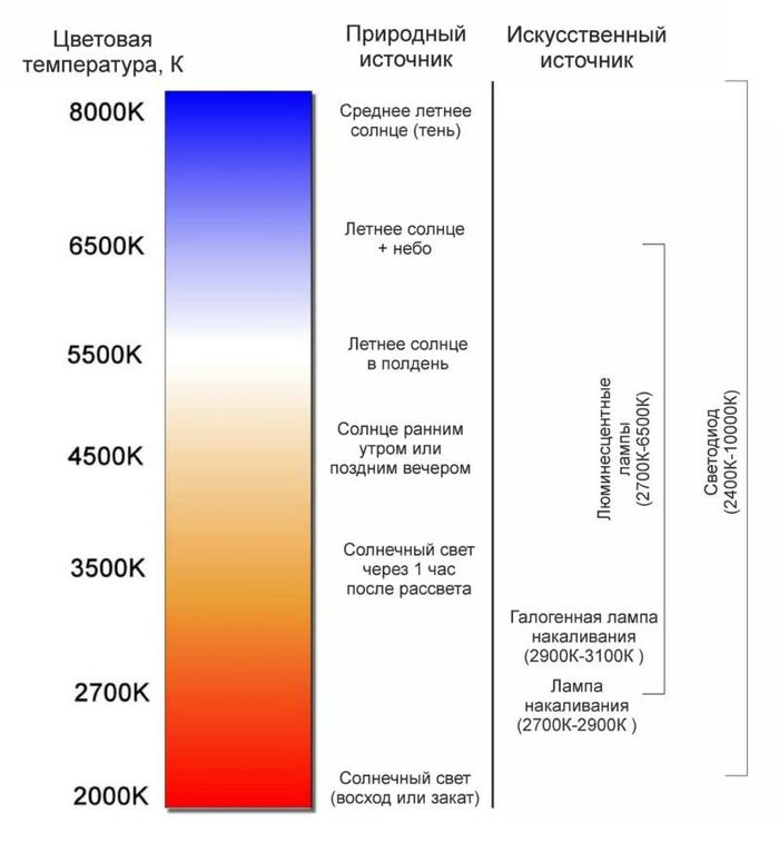 Чтобы вечерний голубой свет не смог «убить» красный диван, надо, чтобы его подсветил тёплый свет жёлтой лампы. Световые источники характеризуются большим количеством параметров. Один такой параметр – это цветовая температура. Такая температура какой-либо лампы является температурой так называемого совершенно чёрного тела.