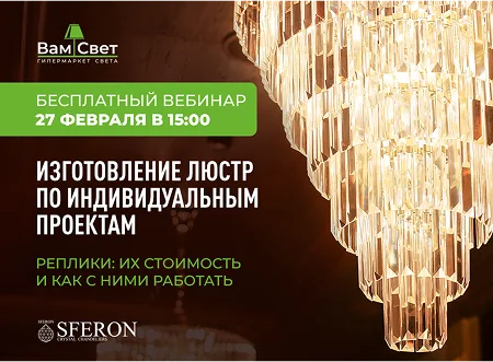 На вебинаре 27 февраля эксперт от бренда FERON расскажет про нюансы индивидуального производства люстр любой сложности и размеров, о которых должен знать каждый дизайнер.